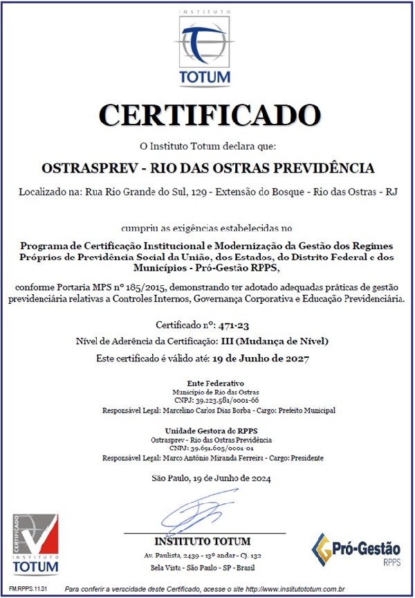 Em junho/2024 a certificação foi obtida junto ao Instituto Totum. O programa atende à portaria MPS nº 185/2015 e o OstrasPrev teve um aproveitamento de 91,66% nas ações auditadas sendo elas: adequação às práticas de gestão previdenciária relativas a controles internos, governança corporativa e educação previdenciária. O certificado é válido por 3 anos.